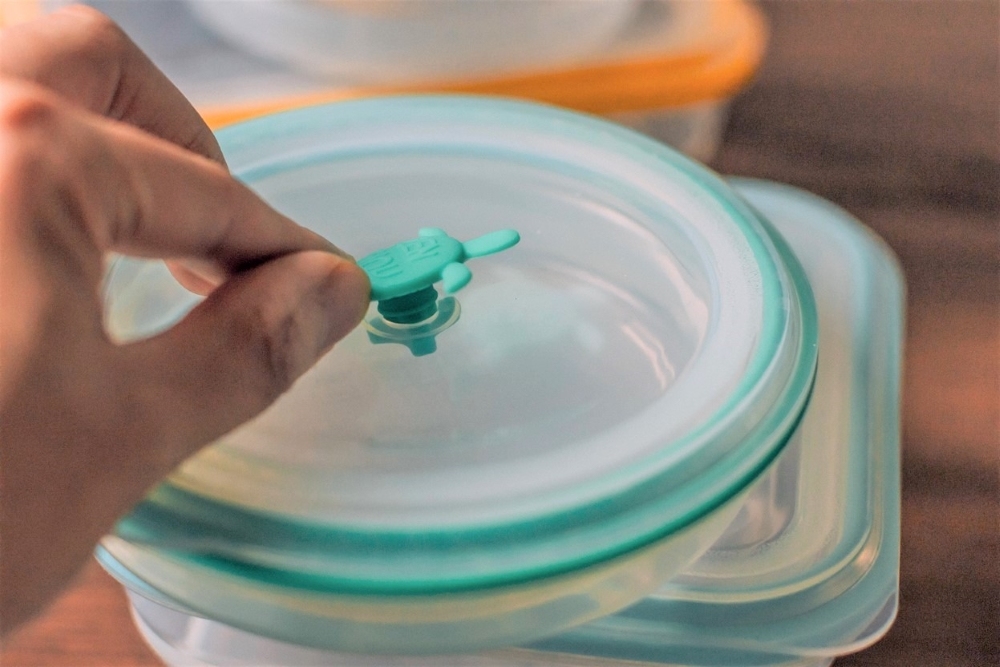 The airlock on thecontainer lid is a flexible sea turtle design. Simply close the airlock for anear vacuum seal to keep food fresh for longer. Open the airlock and put thewhole container into the microwave for safe and easy reheating.