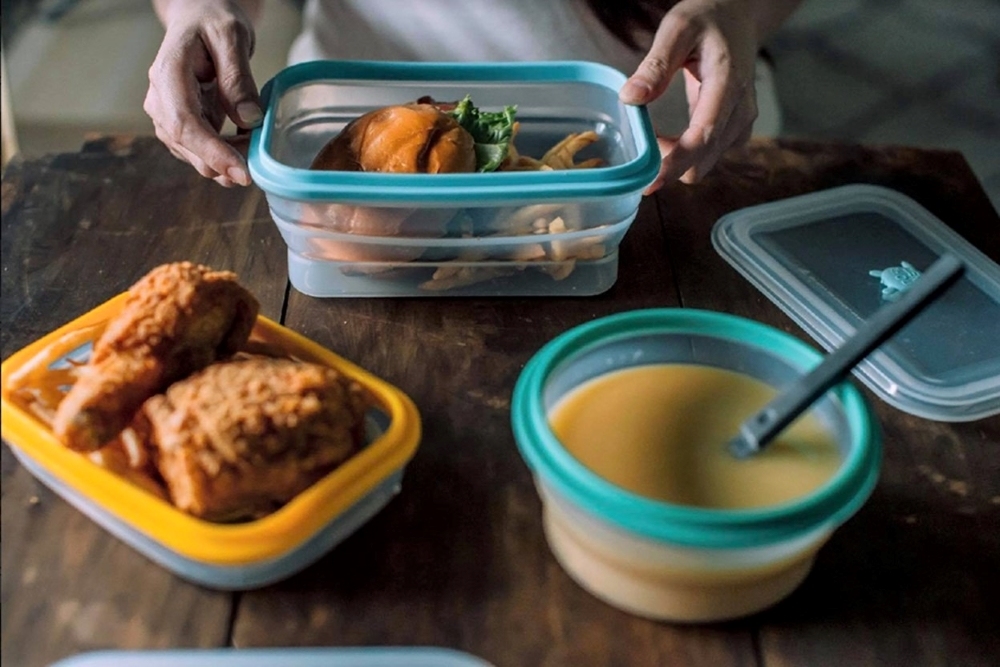 The accordion-style two-stage foldingdesign allows for size adjustment according to the amount of food to be stored.