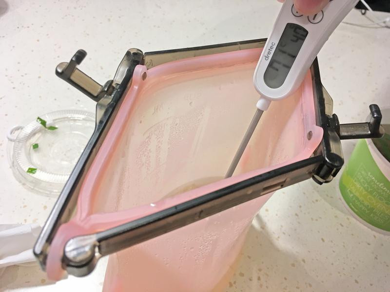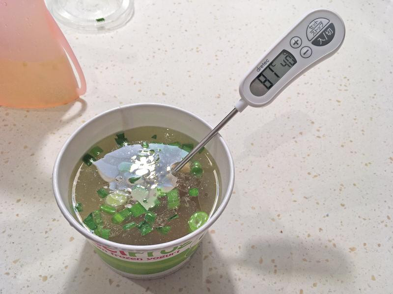 店家先製作好貢丸湯倒進矽密袋,隔約2分鐘盛裝豬血湯。當晚氣溫約15℃,騎車回家約3分鐘路程,到家之後打開測量湯的溫