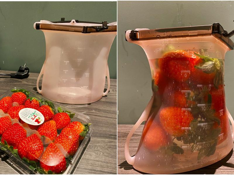 使用矽密袋裝入清水、把草莓放進去清洗乾淨,1500ml 超大容量不用擔心會放不下 15 顆巨型草莓,可以看到圖片中袋子底部還有很多空間,草莓不會互相擠壓受傷,洗完把水倒掉可以直接享用,不用再另外找容器!