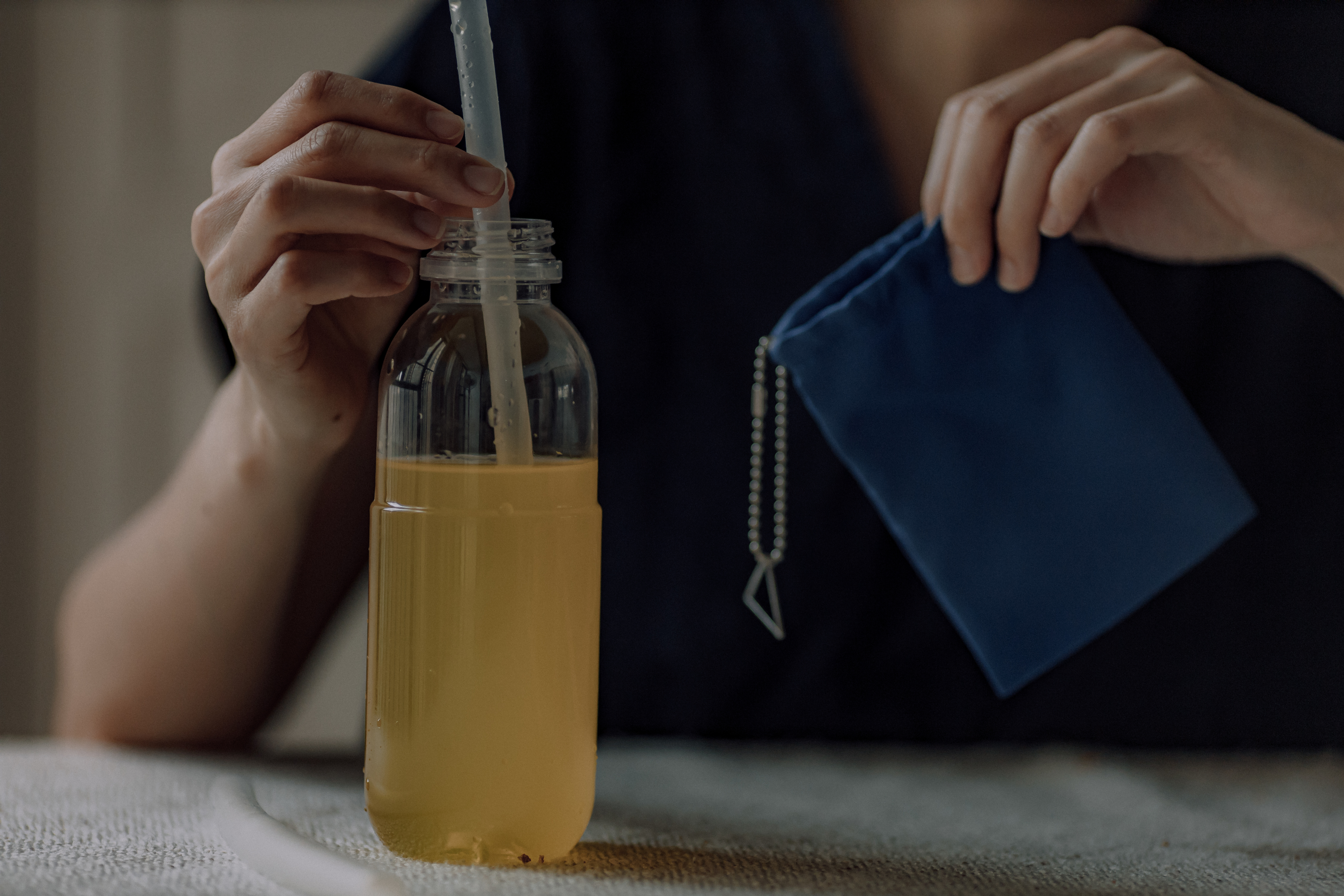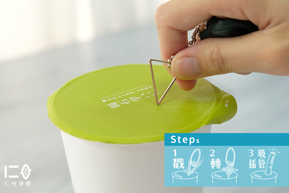 可輕巧對摺收入防沾塵袋中,首創「三稜膜戳」設計,繫掛袋上隨飲隨用。手心大小好隨攜,力行減塑最暖心!