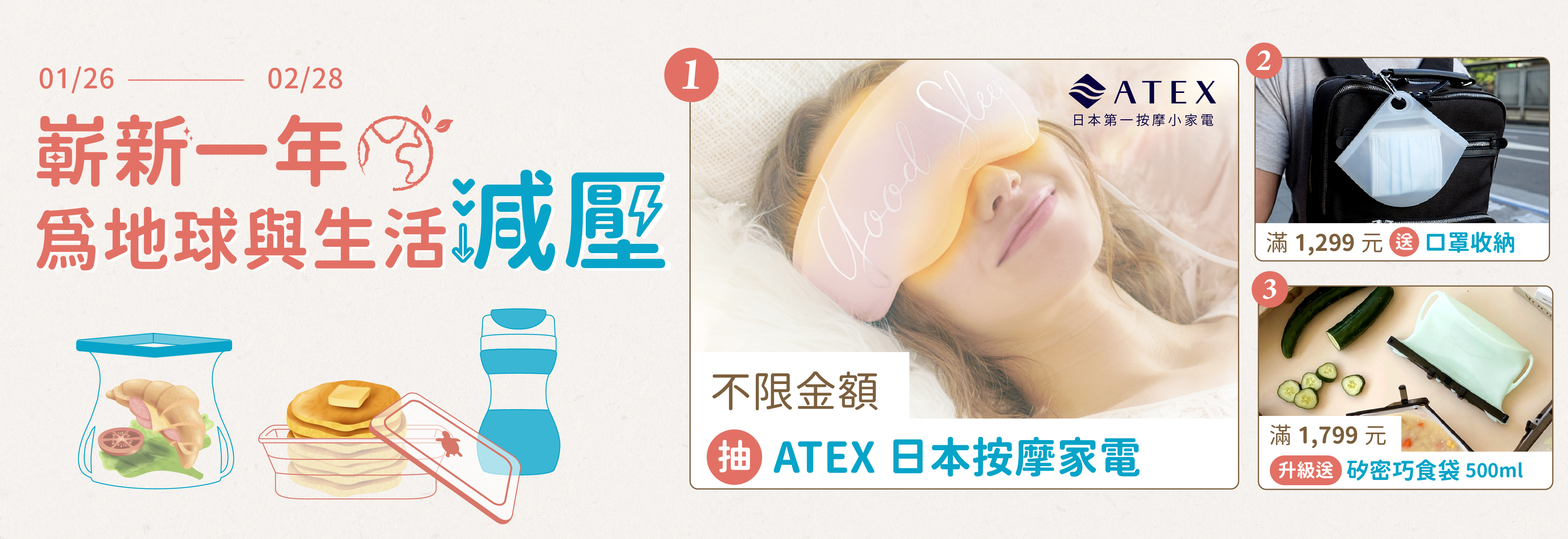 一獎|ATEX 溫熱手部按摩器,價值新台幣3,980元,共3名;二二獎|ATEX 3D舒眠眼罩,價值新台幣2,180元,共5名。