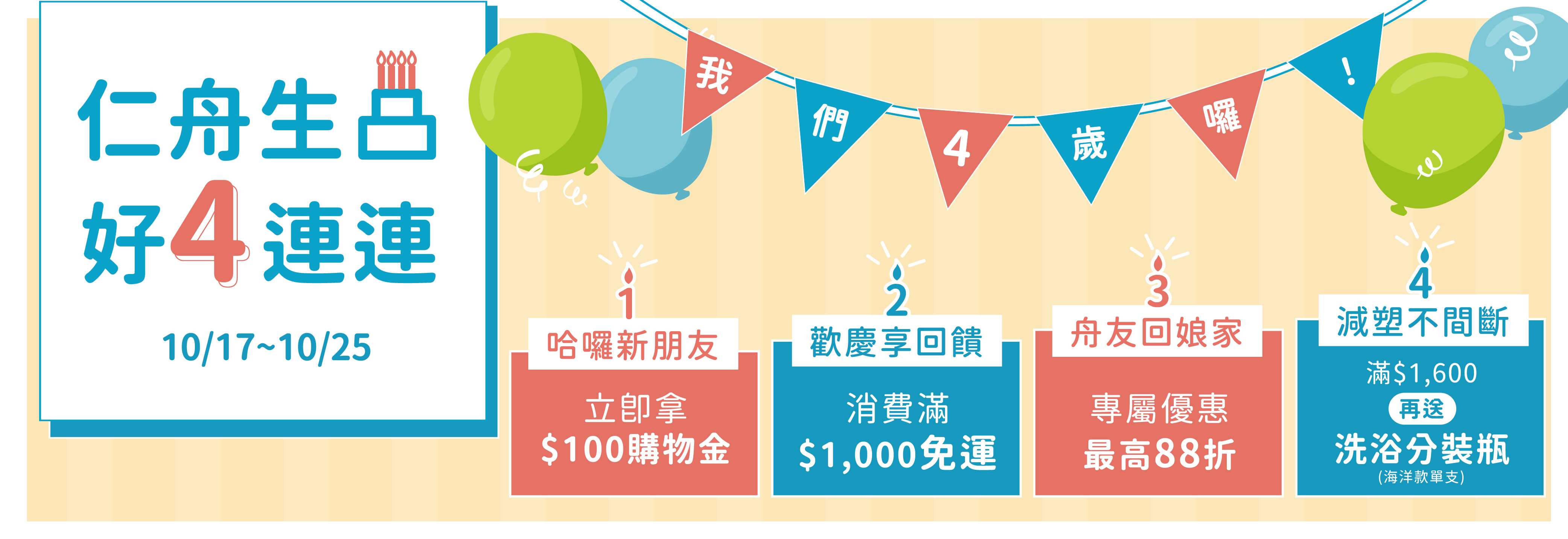 <同舟好朋友>全站訂單滿$1,400,享優惠價再95折,每一會員帳號僅可享使用一次優惠。