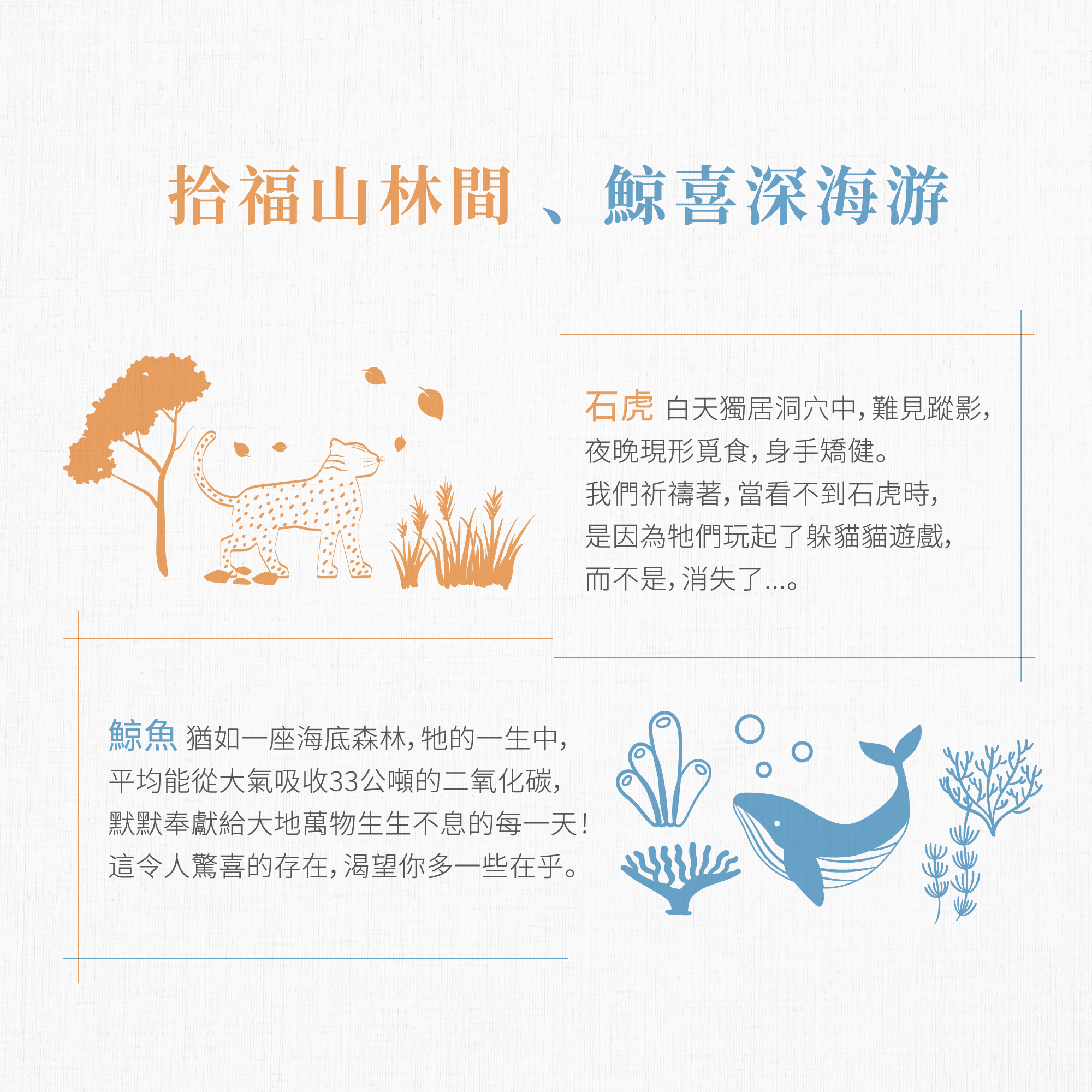 呼籲我們要淨愛山林和海洋,還給石虎、鯨魚純淨家園,開心居住