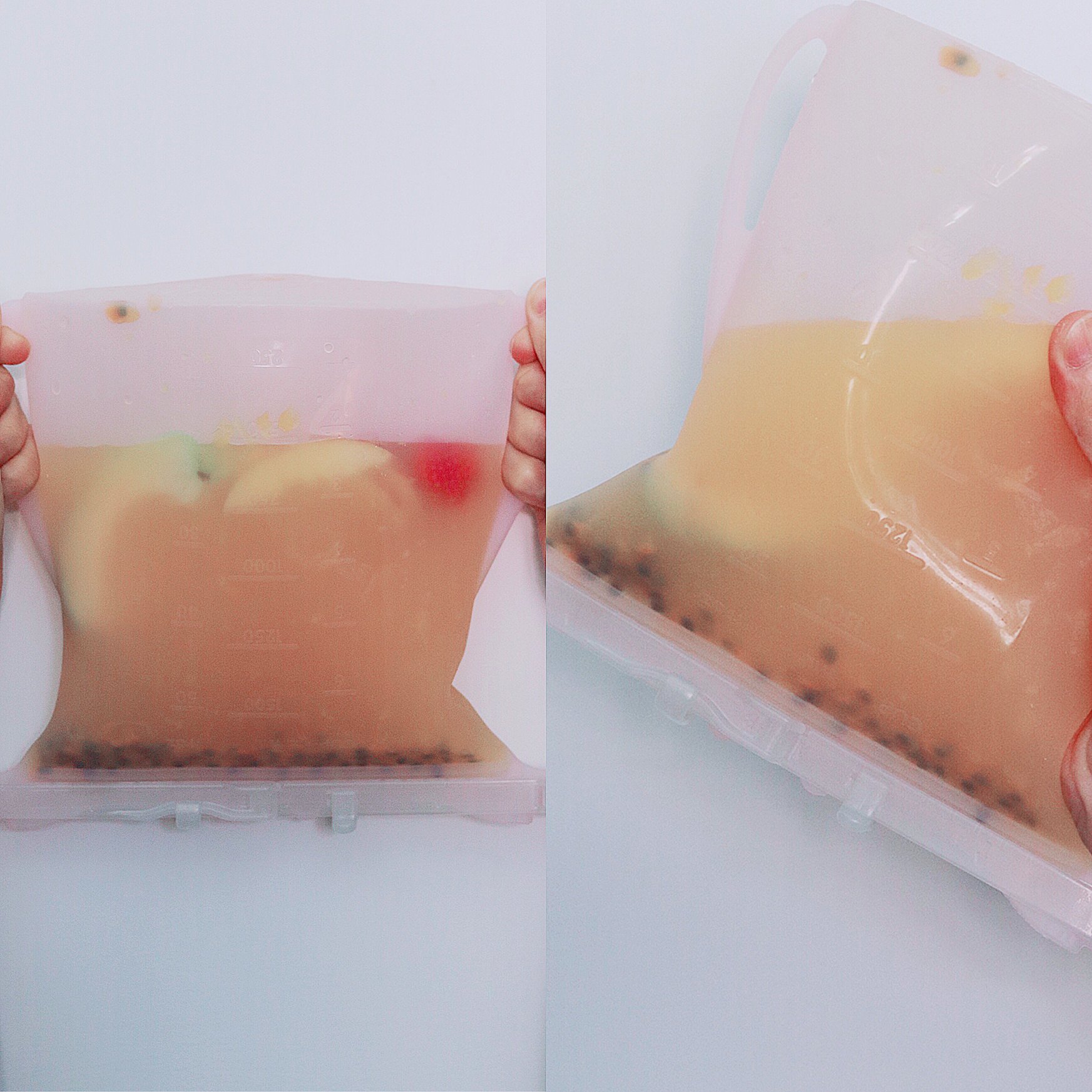 《為什麼?仁舟淨塑不同的地方在哪兒?》 因為矽密盒跟矽密袋 輕巧、好攜帶、可放冰箱冷凍亦可微波,同時最重要的是,它們不會翻漏。 從照片上你可以看到,用來裝湯湯水水直接完全倒放都沒有問題👍
