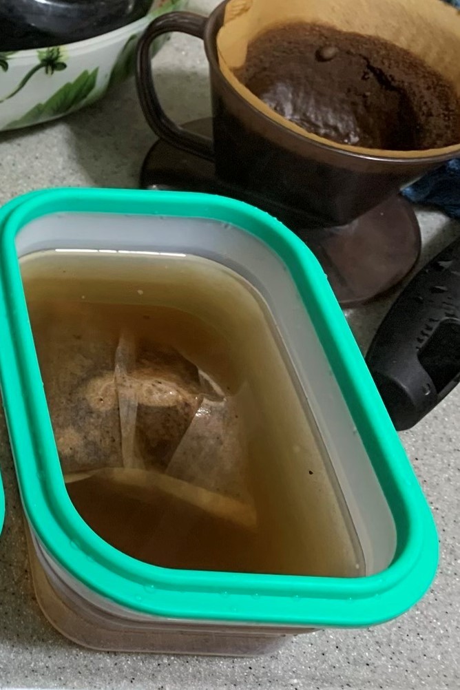 將咖啡渣放入濾茶器中並放入矽膠容器,沖入100°C的熱水,並緊閉容器至少4小時,若味道較重可以拉長浸泡時間。