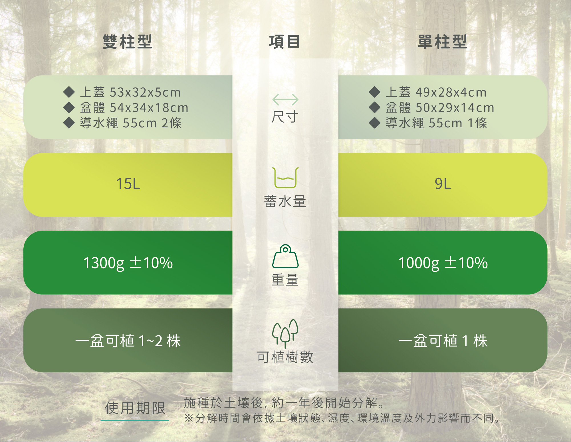 15公升儲水量,可幫助樹苗度過最需守護的階段,以回收再生紙漿與天然可分解材料融合製作的樹盆,